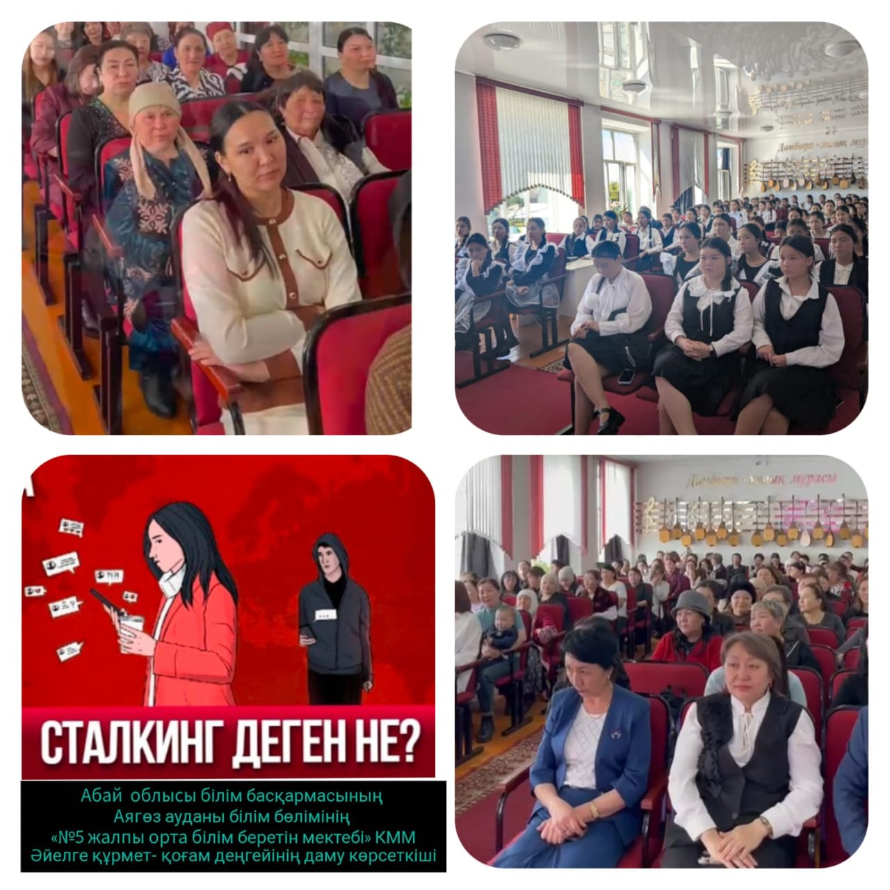 Абай облысы білім басқармасының Аягөз ауданы білім бөлімінің «№5 жалпы орта білім беретін мектебі» КММ-де «Әйелге құрмет қоғамның даму деңгейінің көрсеткіші» ұранымен некеге мәжбүрлеу, сталкинг және әйелдерге қатысты өзгеде зорлық- зомбылық түрлеріне қатысты құқықтық сауаттылықты арттыру және нөлдік төзімділікті қалыптастыру туралы ақпараттандырылды.