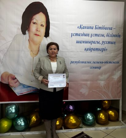 Семинар қорытындысы бойынша Қ.Ө. Бітібаеваның республикалық ғылыми-әдістемелік зертханасының жетекшісі, педагогика ғылымдарының докторы, профессор Қ.О. Мұқашева тарапынан сертификат табысталды.