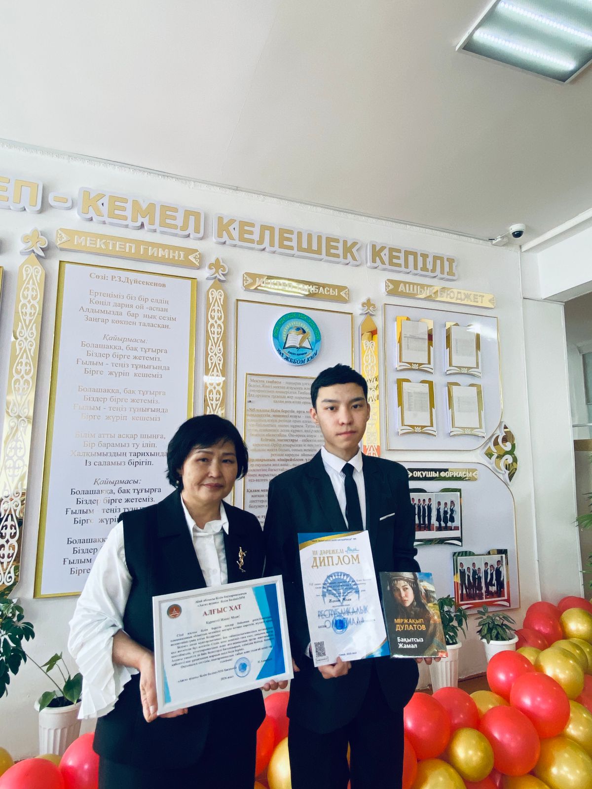 9 “Б”сынып оқушысы Жанат Мади Құқық негіздері пәніне қатысып III орын иеленді.