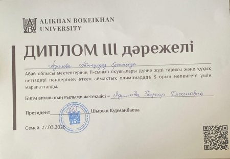 Екі кезең қорытындысы бойынша:Абай облысы мектептерінің 11-сынып оқушылары дүние жүзі тарихы және құқық негіздері пәндерінен өткен олимпиадада Адилова Айжұлдыз 3 орын иеленді.